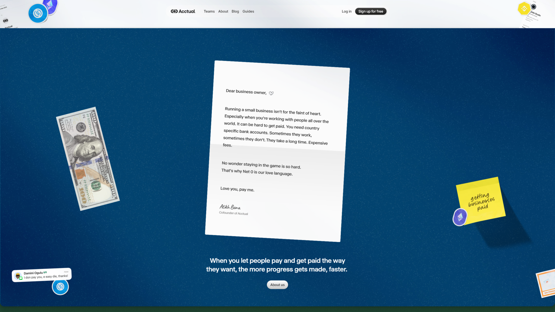 This is a letter from the co-founder of Acctual to the business owners they’d like to work with. The letter feels physical, in fact the whole section feels like you’re looking at something real.